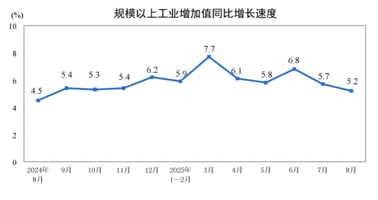 8月份,规模以上工业增加值同比实际增长5.2%(前值增长5.7%),环比增长0.37%(前值增长0.38%)。