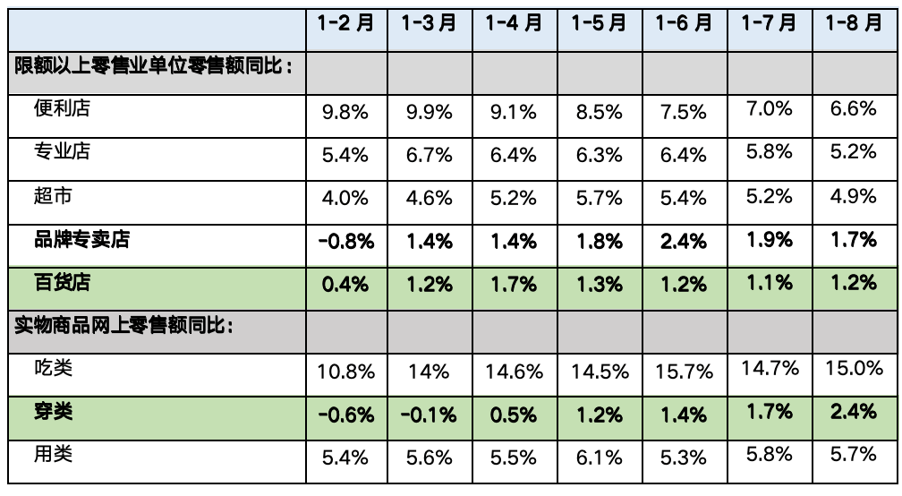 8月份社零、投资和出口以及生产增速全面回落,经济延续放缓趋势。其中,社零增速已连续3个月回落至3.4%,达到年内最低值。服装、鞋帽、针纺织品可选消费增速依然低于社零整体水平。值得关注的边际改善的指标是:8月份服装、鞋帽、针纺织品类商品零售额同比增速较7月份加快1.3个百分点,1-8月份穿类商品网络零售额同比增速较1-7月份加快0.7个百分点。8月份,规模以上工业增加值同比增长5.2%,依然高于需求侧增速。在通胀方面,8月份CPI同比再度专负,PPI持续为负(降幅收窄)。整体来看,国内经济持续面临着下行压力。