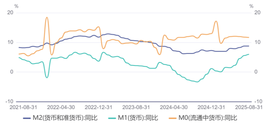 8月份,M2同比增长8.8%,较7月增速持平;M1同比增长6.0%,较7月上升0.4个百分点;M0同比增长11.7%,较7月下降0.1个百分点。2025年8月活期存款(M1-M0)环比增长0.12%,定期存款(M2-M1)环比上升0.85%。