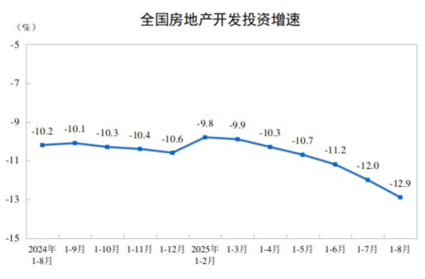 分领域来看,1-8月份,制造业投资同比增长5.1%(前值增长6.2%),基础设施投资(不含电力、热力、燃气及水生产和供应业)同比增长2.0%(前值增长3.2%),房地产开发投资同比下降12.9%(前值下降12.0%),住宅投资下降11.9%(前值下降10.9%)。