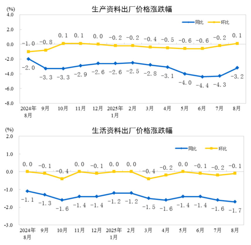 8月份,全国工业生产者出厂价格同比下降2.9%(前值下降3.6%),降幅比上月收窄0.7个百分点,为今年3月份以来首次收窄,环比由下降0.2%转为持平;工业生产者购进价格同比下降4.0%,环比持平。1-8月平均,工业生产者出厂价格比上年同期下降2.9%,工业生产者购进价格下降3.3%。