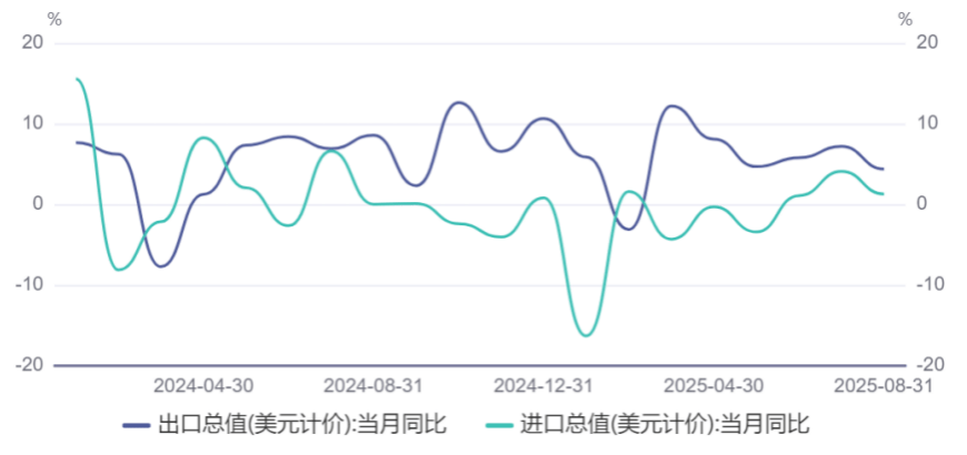 8月份,按美元计(下同),出口同比增长4.4%(前值增长7.2%);进口同比增长1.3%(前值增长4.1%)。