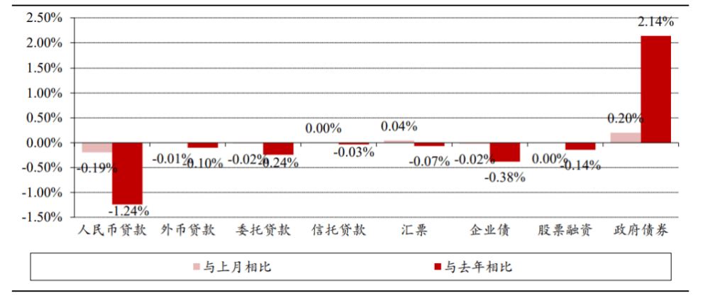 8月份,新增社融同比少增4630亿元。从结构来看,政府债券融资同比少增2519亿元,社融口径人民币贷款(不含非银金融机构数据)同比少增4178亿元。政府债券新增融资1.37万亿,占社融新增总额2.57万亿的53%,政府债券仍是新增社融的主要支撑。