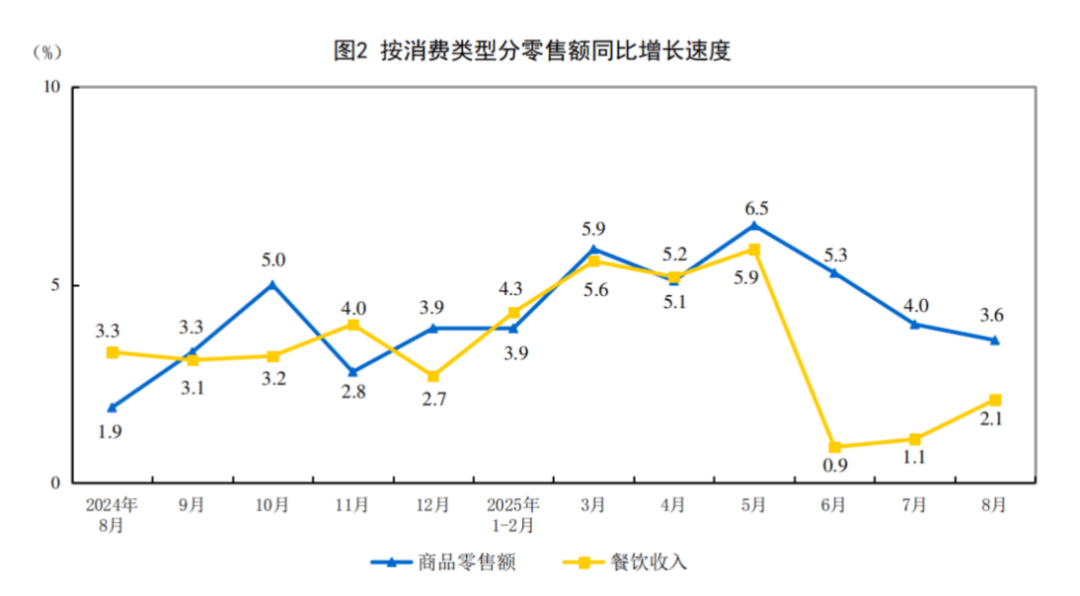 按消费类型分,8月份,商品零售同比增长3.6%,餐饮收入同比增长2.1%;服装、鞋帽、针纺织品零售额同比增长3.1%。