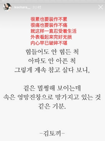 25日深夜,具荷拉在社交媒体Instagram发布了忧郁的文字,包括只写了“再见”的帖子,以及充满负面情绪的限时动态,内文写着:“很累也要装作不累,很痛也要装作不痛,就这样忍受着继续生活。”引发外界关注。
