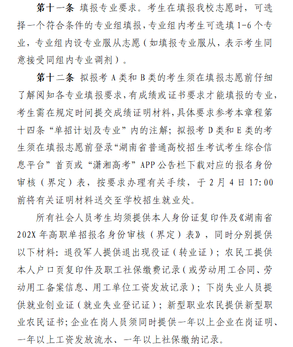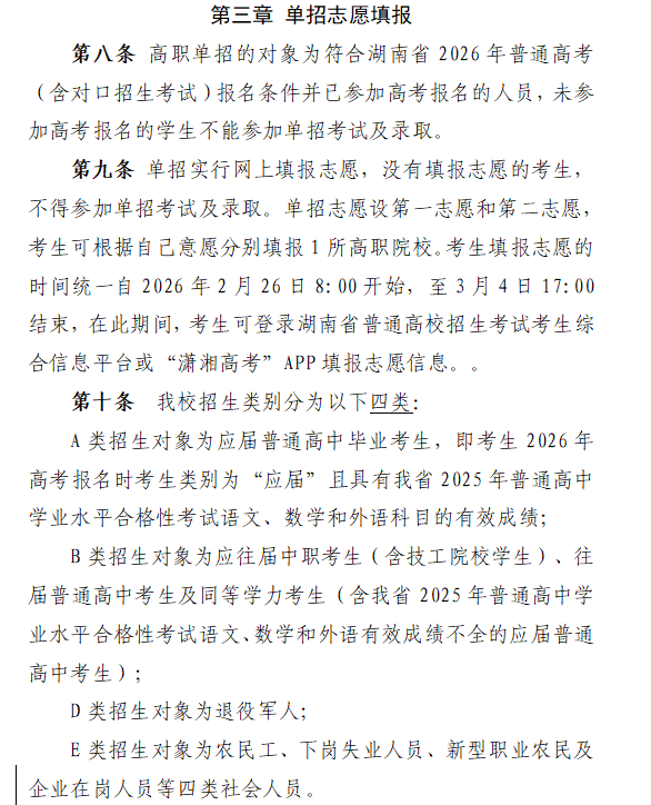 第一步,确认报名资格。本次单招对象为已参加湖南省2026年普通高考(含对口招生考试)报名的人员,未参加高考报名的考生无法参与本次单招考试及录取。学校将招生类别分为四类,考生需明确自身所属类别:A类为应届普通高中毕业生,需具备相应高中学业水平合格性考试语、数、外三科有效成绩;B类为应往届中职考生、往届普通高中考生及同等学力考生;D类为退役军人;E类为农民工、下岗失业人员、新型职业农民及企业在岗人员等社会人员。