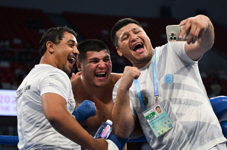 2025年8月14日,在成都世运会自由搏击男子K1 91公斤以上级铜牌赛中,乌兹别克斯坦选手巴拉托夫战胜法国选手库利巴利,获得铜牌。图为巴拉托夫(中)与教练在比赛后庆祝胜利。新华社记者 张博文 摄